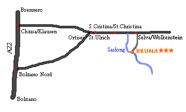 WIE MAN UNS ERREICHT: die Brennerautobahn A22 bei Klausen verlassen und Richtung Gröden fahren. Wolkenstein ist am Ende des Grödnertales, vor dem Sellastock. Sie fahren der Landstraße nach, bis ins Zentrum Wolkensteins. An der Kreuzung (Nivesplatz) befindet sich auf Ihrer Rechten das Hotel Oswald. Hier rechts abbiegen und der Str. La Selva entlang fahren. Am Ende der Straße, nach ca. 1,5 km, befinden sich die Skipiste der "Saslong" und das Residence Bruna: Sie sind angekommen! |
